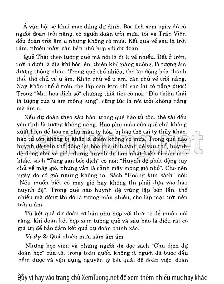 + Sách chủ yếu giới thiệu các ví dụ đoán quẻ tích lũy được trong thực tiễn của tác giả. Trong sách có phương pháp đoán theo tượng quẻ, đoán theo tượng hào và phương pháp đoán kết hợp. Ngoài ra có một số quẻ được chọn lựa từ tinh hoa của các học viên, một số nữa là chọn những quẻ hay, điển hình trong sách cổ. Trong lời giải quẻ luôn thể hiện nhất quán các phương pháp đoán quẻ cơ bản là: “một hào động”, “tượng quẻ”, “dịch lí”, “số lí”, “ngũ hành sinh khắc” và “ngoại ứng”.