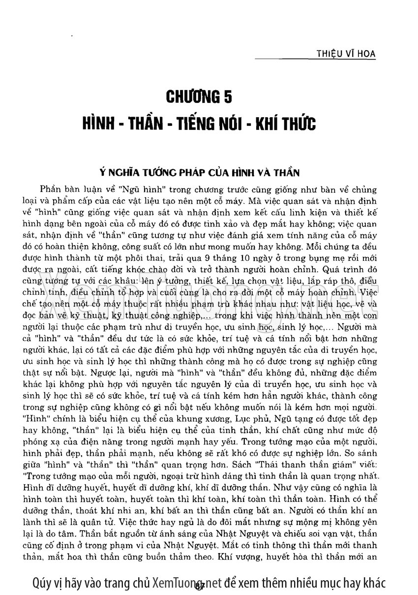 Sách "Tìm hiểu nhân tướng học theo kinh dịch" của tác giả Thiệu Vĩ Hoa cho chúng ta một cách nhìn toàn diễn về bản chất của thuật nhân tướng. Hầu hết chúng ta khi nói đến tướng thuật đều nghĩ đến khuôn mặt. Tuy nhiên như vậy có nghĩa là chỉ quan tâm đến phần hình dạng bên ngoài mà chưa chú trọng đến bản chất bên trong của thuật nhân tướng. Tướng thuật là nhìn tướng một người mà đoán được tuổi thọ, tài lộc, vận hạn... của họ, thậm chí của tổ tiên, cha mẹ, anh chị em trong gia đình người đó.