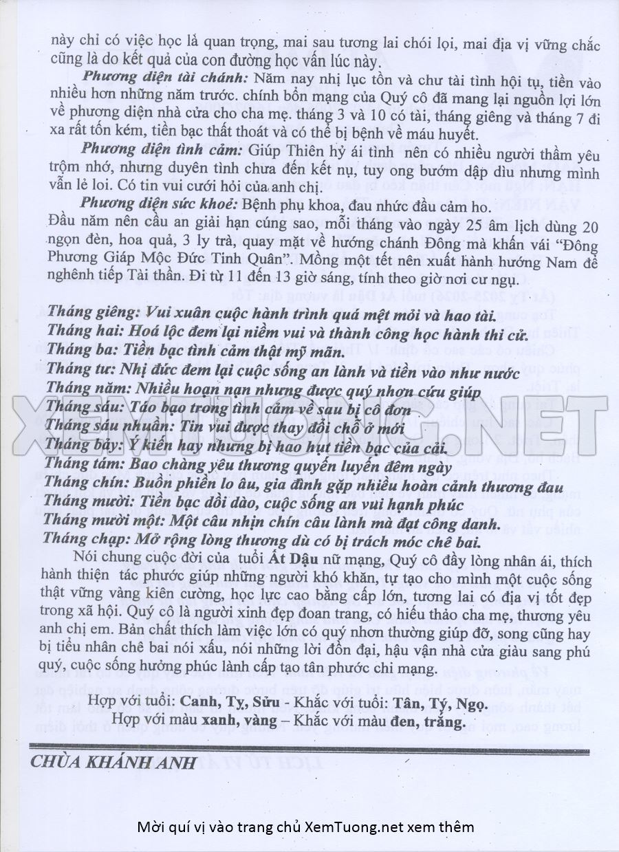 Tử Vi Năm Ất Tỵ 2025 mạng nữ ẤT DẬU