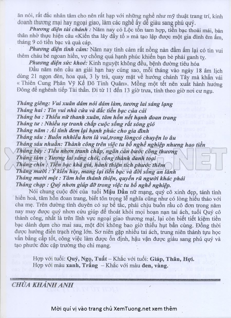 Tử Vi Năm Ất Tỵ 2025 mạng nữ MẬU DẦN
