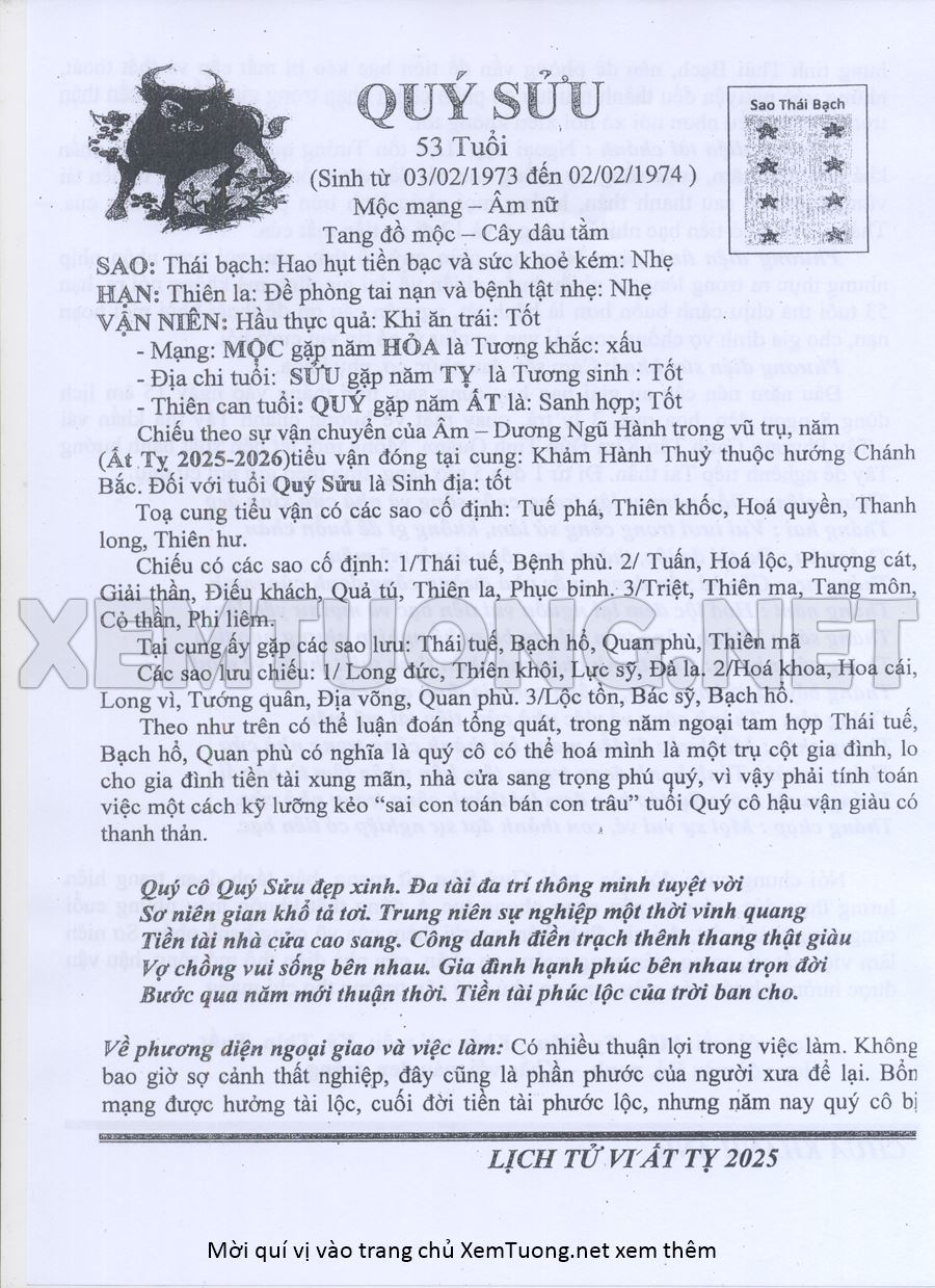 Tử Vi Năm Ất Tỵ 2025 mạng nữ QUÝ SỬU