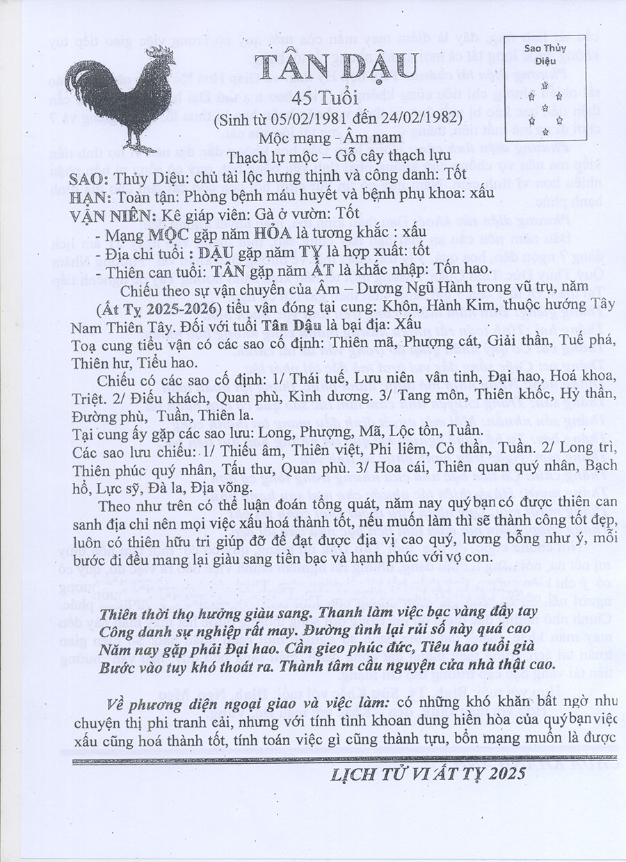 XEM SAO HẠN, TAM TAI, KIM LÂU, HOANG ỐC NĂM ẤT TỴ 2025