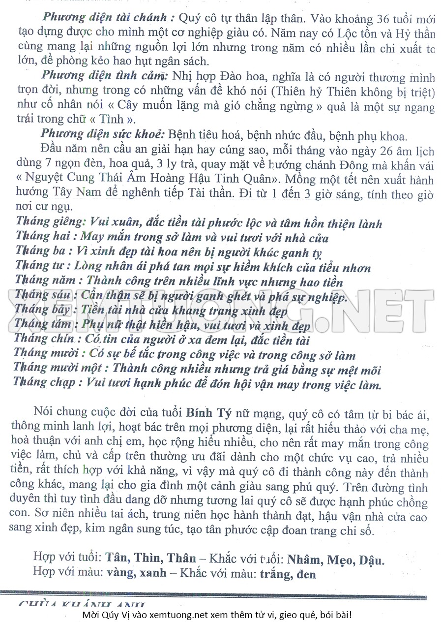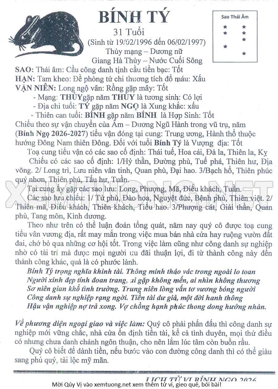 Tử Vi Năm Bính Ngọ 2026 mạng nữ BÍNH TÝ