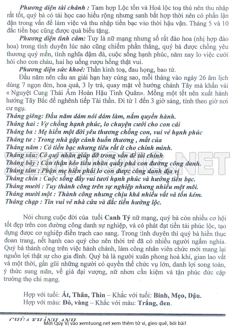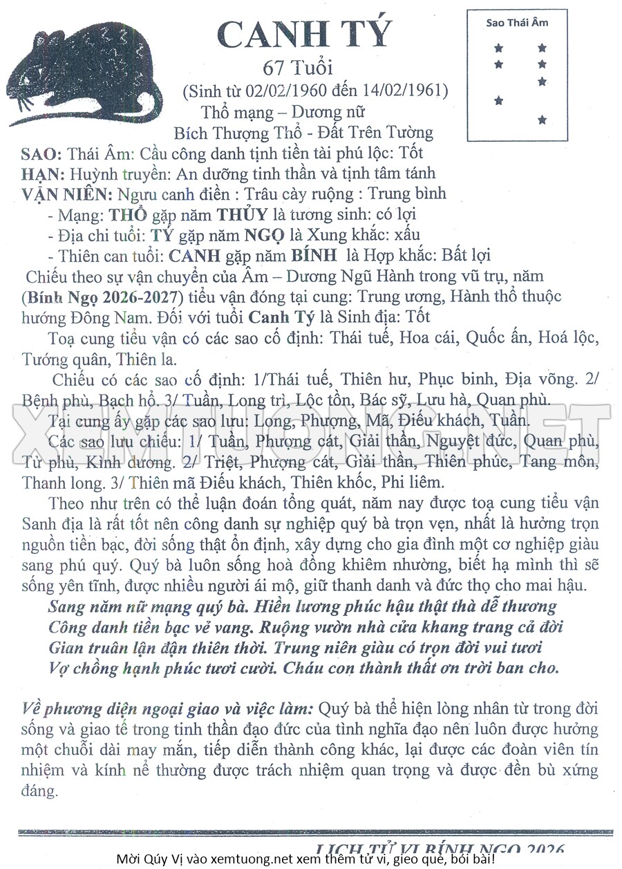 Tử Vi Năm Bính Ngọ 2026 mạng nữ CANH TÝ