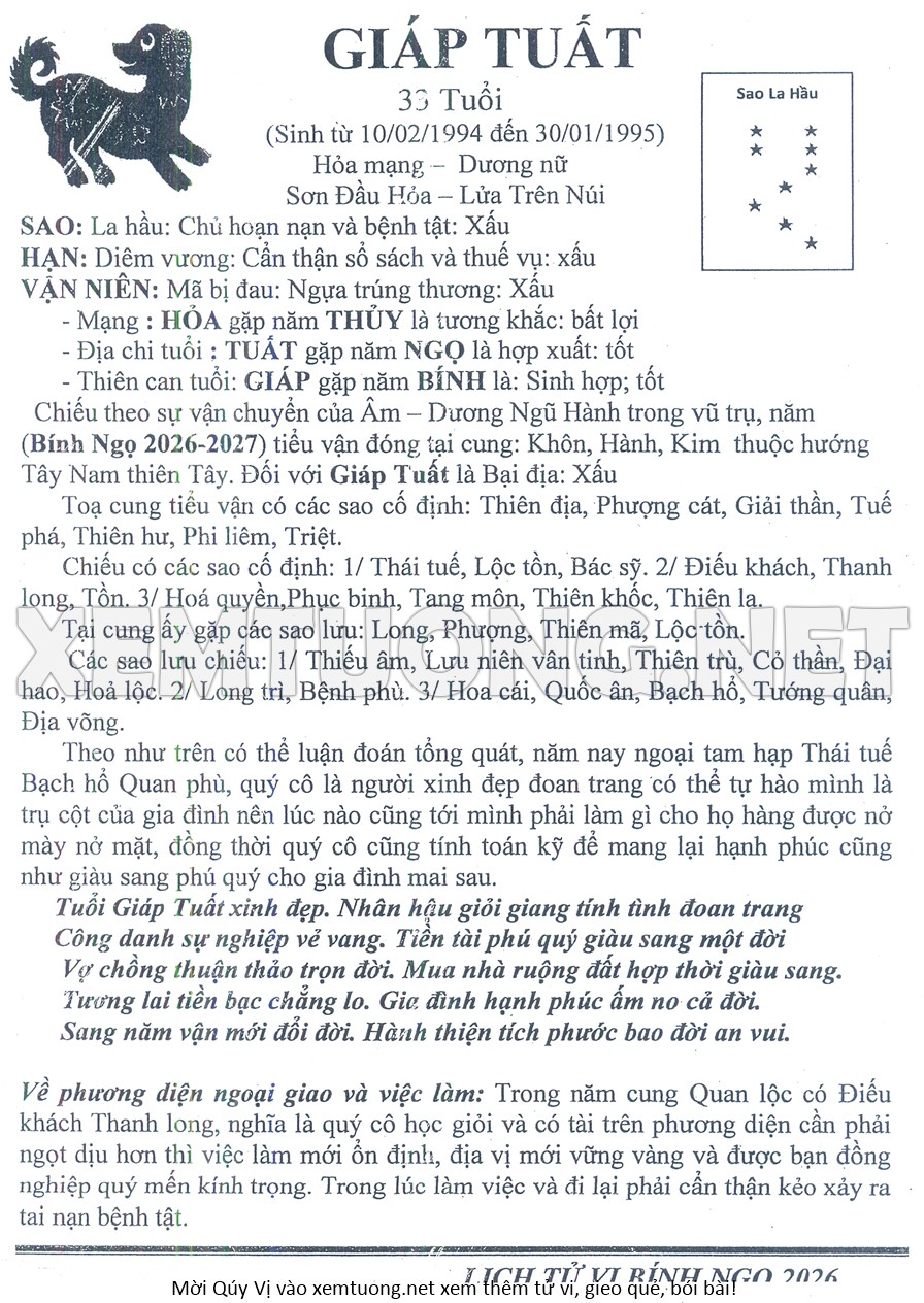 Tử Vi Năm Bính Ngọ 2026 mạng nữ GIÁP TUẤT