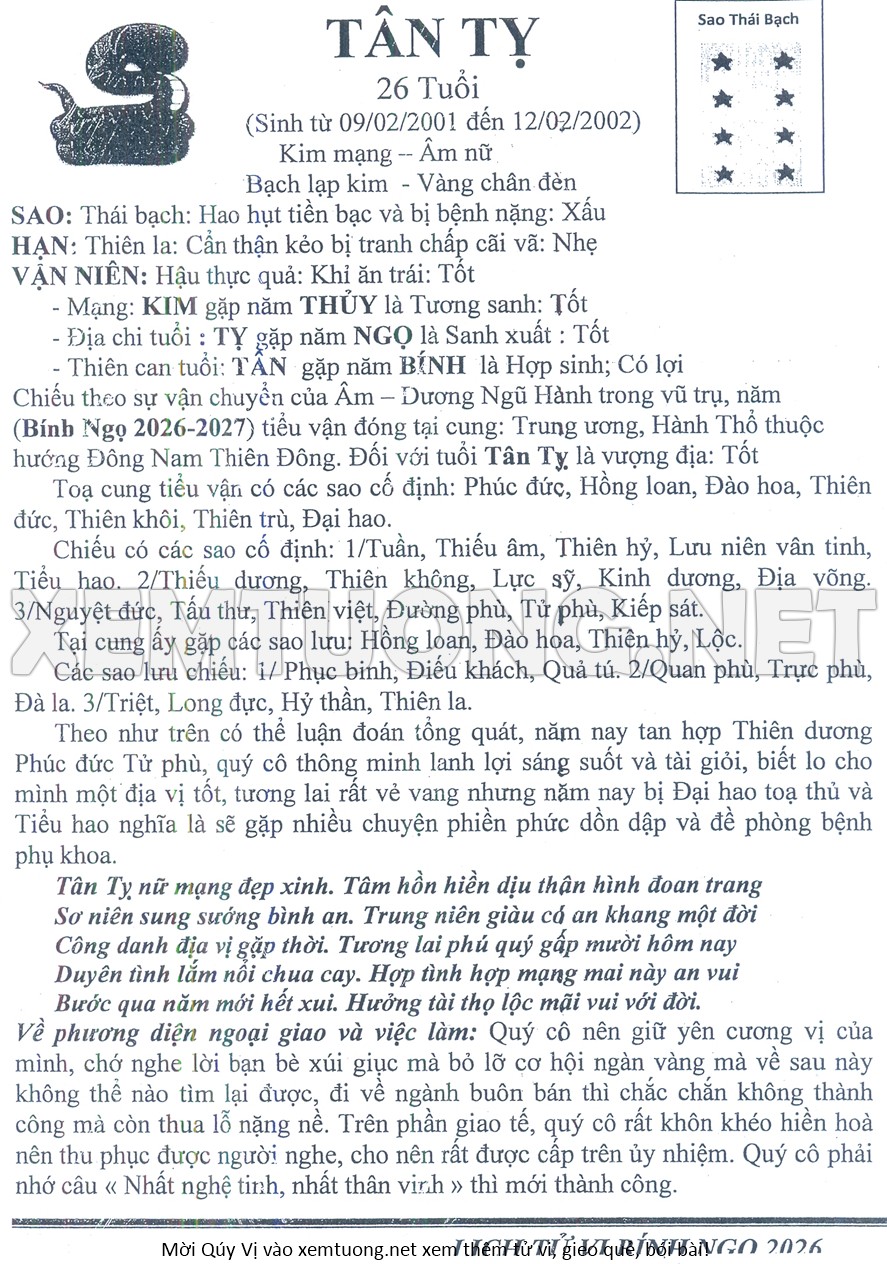 Tử Vi Năm Bính Ngọ 2026 mạng nữ TÂN TỴ