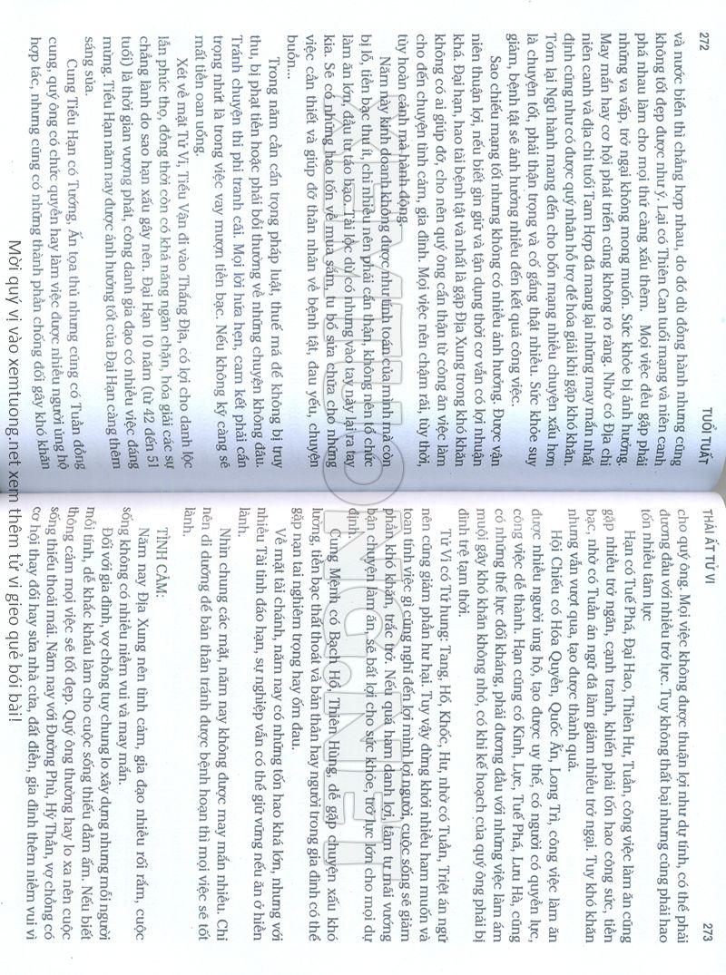 (Lưu ý: Thái Ất Tử Vi được chúng tôi scan từ sách, do đó mỗi tuổi sẽ có nhiều trang, quý vị xem xong hãy nhấn vào trang tiếp theo để xem hết phần tuổi muốn xem. Nếu quý vị xem bằng điện thoại thì hãy kéo qua lại để xem phần bị khuất.)