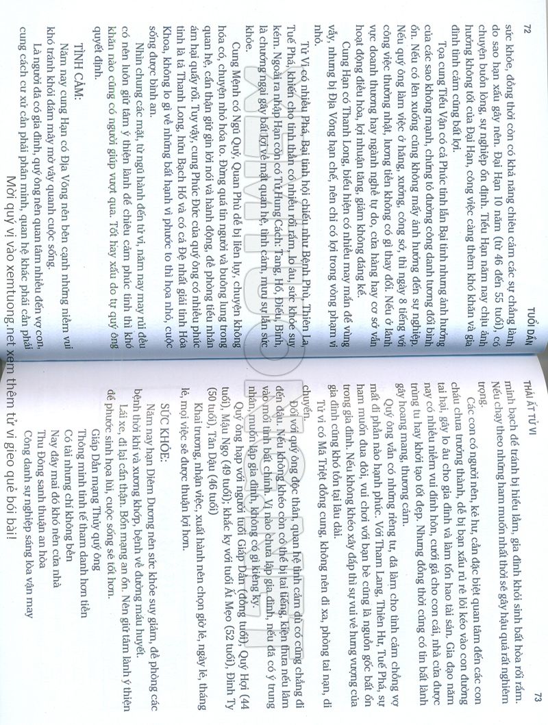 (Lưu ý: Thái Ất Tử Vi được chúng tôi scan từ sách, do đó mỗi tuổi sẽ có nhiều trang, quý vị xem xong hãy nhấn vào trang tiếp theo để xem hết phần tuổi muốn xem. Nếu quý vị xem bằng điện thoại thì hãy kéo qua lại để xem phần bị khuất.)